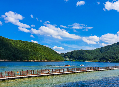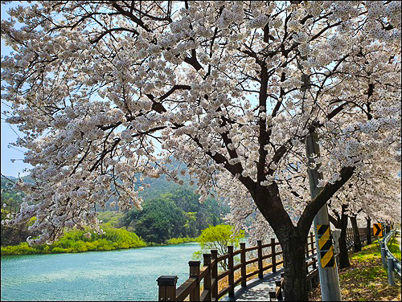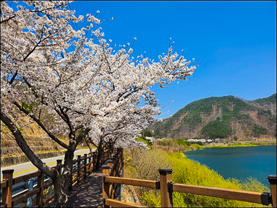 설치되어 안전하게 걸을 수 있으나, 일부 구간은 도로변을 걸어야 하는 불편함이 있다. 그럼에도 불구하고 국도 제30호선과 국도 제59호선의 7㎞ 도로로 이어지는 멋진 드라이브 코스를 걸어가며 성주호의 운치를 다양하게 맛볼 수 있다. 중간 중간에 쉼터가 마련되어 있어 휴식도 취할 수 있다. 성주호길의 또 다른 특징은 호반을 걷는 길이 있는가 하면 부교(浮橋)를 통해 물 위를 걸어가는 구간도 있고, 제법 가파른 길이 섞여 있으면서 산속의 피톤 향과 청정한 공기를 즐길 수 있다 |