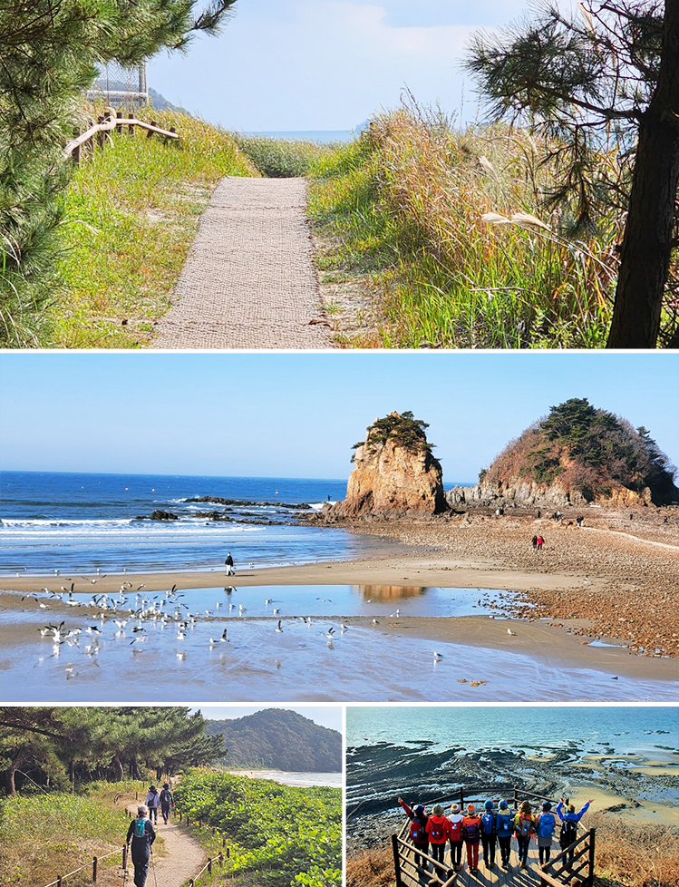 태안해변길 중 가장 인기가 좋은 태안 노을길은 백사장항을 출발하여 꽃지해수욕장까지 이어지는 해변 길로 안면도 북쪽에서 섬의 남쪽으로 내려가는 코스다. 오른쪽으로 서해를 바라보며 안면송이 가득한 해변 길을 걷게 된다. 백사장항을 출발하여 걷다 보면 세 개의 봉우리가 인상적인 삼봉해변과 울창한 곰솔 숲을 지나고 기지포해수욕장이 나온다. 노을길 중 가장 다양한 탐방로가 있는 기지포에는 해안사구와 탐방지원센터가 있다. 휠체어나 유모차도 쉽게 다닐 수 있도록 나무 데크도 설치되어 있어 천사 길이라고도 불린다. 창정교를 지나 올라가면 두여전망대가 나타나는데 이곳은 노을길 가운데서도 가장 좋은 전망을 감상할 수 있는 포인트. 독특한 습곡이 내려다보이며 먼바다의 탁 트인 조망이 가슴을 후련하게 한다. 방포항 근처에는 천연기념물 모감주나무 군락이 있고 방포 전망대가 있어 여기서 꽃지해변이 보인다. 노을길 마지막 코스인 꽃지해수욕장은 서해안 일몰이 아름답기로 유명하다.