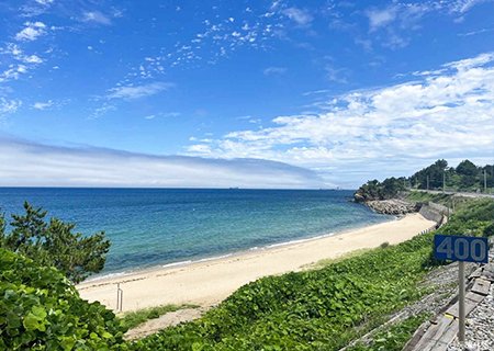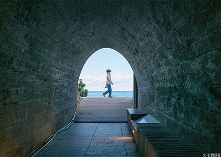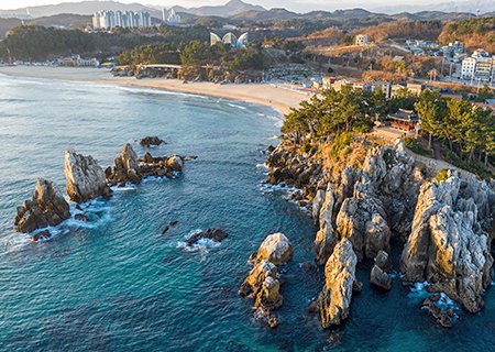 추암해변은 기암괴석이 늘어선 해안절벽과 고운 백사장이 아름다운 해변이다. 해변의 크기는 작은 편이지만 절경을 감상하기에는 충분하다. 추암해변은 해돋이 명소로 유명한데, 그중 추암 촛대바위는 사시사철 여행객의 발길이 끊이지 않는 명소 중 명소다. 애국가 방송 첫 소절의 배경화면에 등장하는 바위는 하늘을 향해 곧게 뻗은 기암 끝에 해가 걸린 모습이 촛불 같아 ‘추암 촛대바위’라고 불린다. 추암촛대바위에서 200m 떨어져 있는 해상 출렁다리는 또 다른 볼거리다.