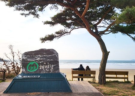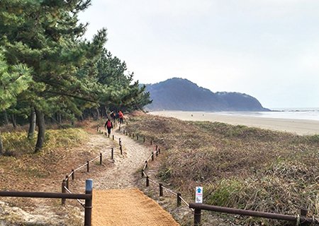 태안해변길 중 가장 인기가 좋은 태안 노을길은 백사장항을 출발하여 꽃지해수욕장까지 이어지는 해변 길로 안면도 북쪽에서 섬의 남쪽으로 내려가는 코스다. 오른쪽으로 서해를 바라보며 안면송이 가득한 해변 길을 걷게 된다. 백사장항을 출발하여 걷다 보면 세 개의 봉우리가 인상적인 삼봉해변과 울창한 곰솔 숲을 지나고 기지포해수욕장이 나온다. 노을길 중 가장 다양한 탐방로가 있는 기지포에는 해안사구와 탐방지원센터가 있다. 휠체어나 유모차도 쉽게 다닐 수 있도록 나무 데크도 설치되어 있어 천사 길이라고도 불린다. 창정교를 지나 올라가면 두여전망대가 나타나는데 이곳은 노을길 가운데서도 가장 좋은 전망을 감상할 수 있는 포인트. 독특한 습곡이 내려다보이며 먼바다의 탁 트인 조망이 가슴을 후련하게 한다. 방포항 근처에는 천연기념물 모감주나무 군락이 있고 방포 전망대가 있어 여기서 꽃지해변이 보인다. 노을길 마지막 코스인 꽃지해수욕장은 서해안 일몰이 아름답기로 유명하다.