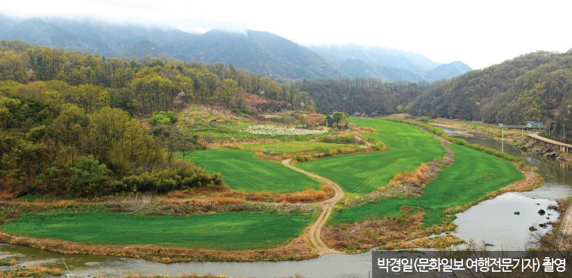 옥천에서 만나는 고향의 풍경이 가장 비현실적으로 빛날 때가 바로 신록이 물들기 시작하는 이즈음이다. 옥천의 금강 상류 물줄기 가운데 가장 급격하게 사행하는 것이 서화천이다. 서화천에서 그림 같은 강변을 따라가는 여정은 작은 마을 지오리에서 출발한다.