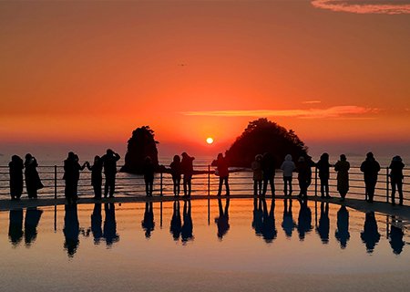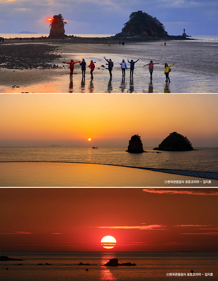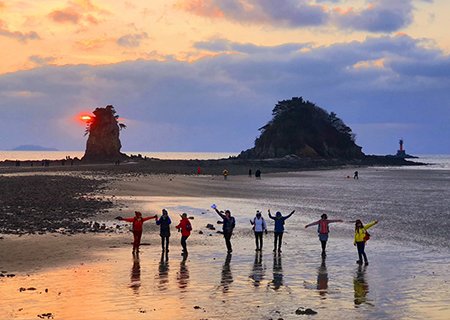 안면도 꽃지해변 일몰여행 - 고운 모래가 깔린 해변과 물이 빠지면 갯벌이 드러나 고동, 조개 등을 잡을 수 있다. - 1,100년 전 신라시대 전쟁 나간 남편을 기다리던 부인과 돌이 된 부인을 보고 같이 돌이 되어버린 금슬 좋은 부부의 전설이 담긴 할미바위와 할아비바위로 유명하다. - 얼굴에 닿는 시원한 바닷바람, 부드러운 모래를 밟으며 도시에서의 걱정은 잠시 뒤로 하고 해변가를 걸어보자.