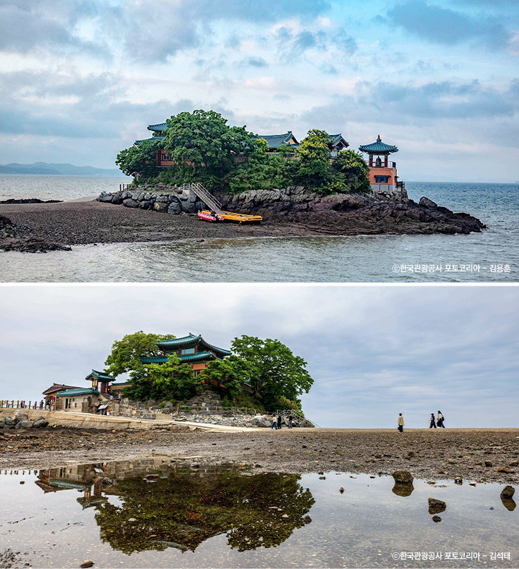 바다를 바라보는 특별한 경치 안면암 - 물위에 떠있는 부상교를 따라 100여미터 정도 걸어서 섬까지 다녀오는 색다른 정취를 맛볼수 있다.