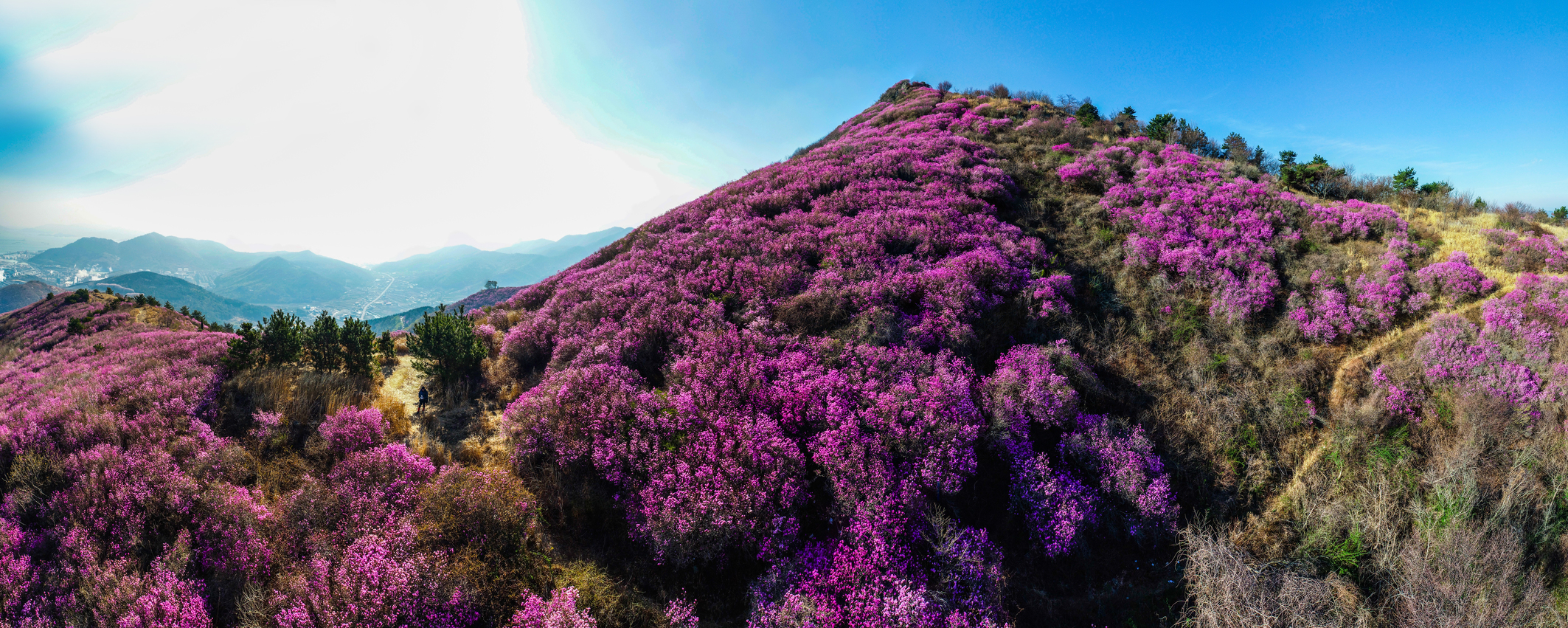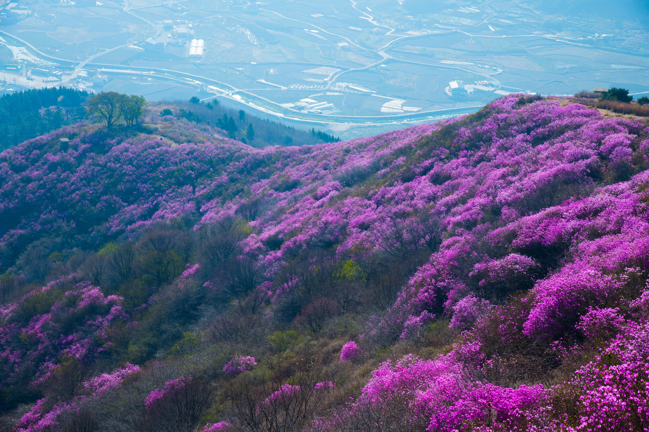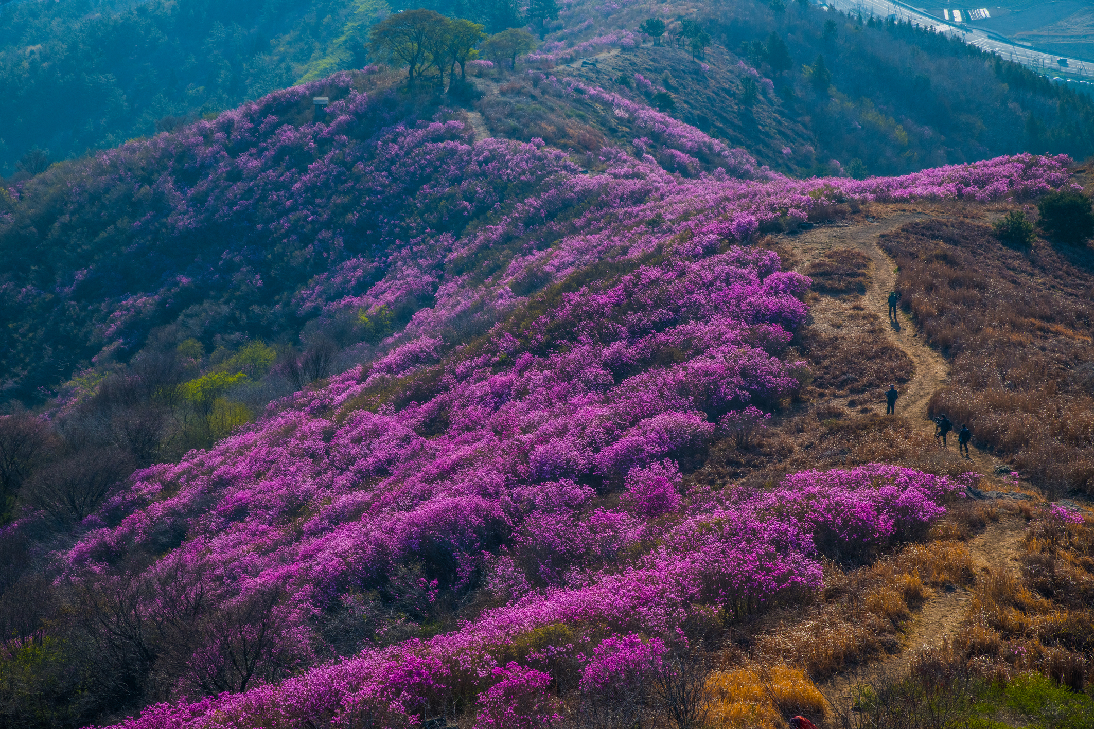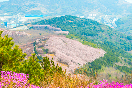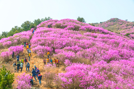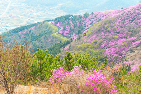 영취산은 해발 510m의 높지 않은 산이다. 산세가 수려하지도, 높지도 않은 영취산이 전국적으로 유명한 것은 봄이면 온 산을 붉게 물들이는 진달래를 국내에서 제일 먼저 볼 수 있는 산이기 때문이다. 경남 창녕의 화왕산, 경남 마산의 무학산과 더불어 전국 3대 진달래 군락지 중 한 곳으로 꼽히는 곳이다. 30~40년생 진달래 수만 그루가 33만여 제곱미터에 걸쳐 군락을 이루어 자생하고 있어, 매년 4월이 되면 온 산을 붉게 타오르게 한다.
