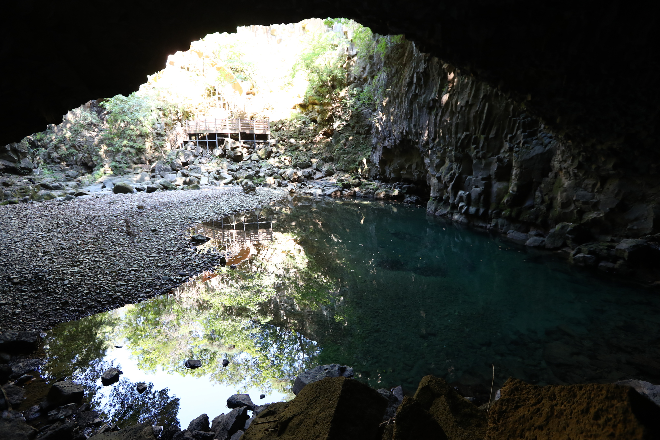 재인폭포는 오래전부터 명승지로서 널리 알려져 있다. 재인폭포는 높이 약 18m에 달하는 현무암 주상절리 절벽으로 쏟아지는 것이 그야말로 장관을 이룬다. 폭포의 이름과 관련된 아름다운 사랑이야기도 전해오고 있다. 재인폭포에서는 다양한 현무암의 특징들을 관찰할 수 있는데, 대표적으로 주상절리를 비롯하여 하식동굴과 포트홀, 가스튜브 등을 볼 수 있다. 높이 약 18m에 달하는 폭포는 계속해서 폭포 아래를 침식시켜서 수심 5m에 달하는 포트홀을 만들었다. 포트홀이란 하천에서 암석의 오목한 곳이나 깨진 곳에 와류(물이 회오리 치는 현상)가 발생하여 깊은 구멍이 생겨난 것을 말한다.