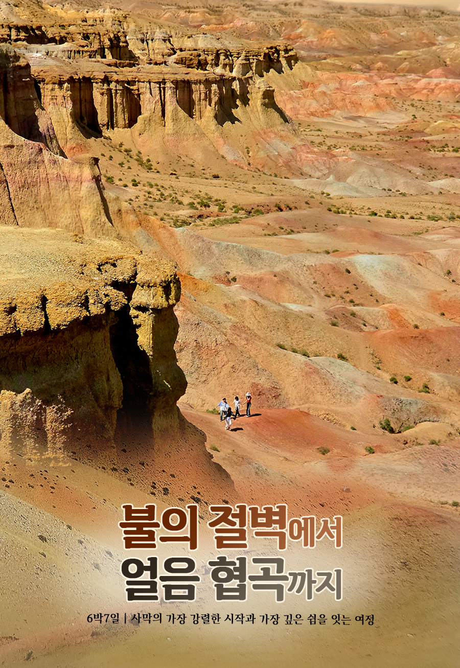 몽골리안 그랜드캐년, '욜린암(Yolyn Am, Yol Valley) - 욜린암은 달란자드가드를 거점으로 들어가는 고비 고르반사이한(Gobi Gurvansaikhan NP) - 국립공원의 사막 한가운데 숨겨진, 여름에도 숨이 차갑게 맑아지는 협곡입니다. ⊙왜 ‘몽골리안 그랜드캐년’인가? - 깎아지른 석회암 절벽 사이로 깊게 패인 협곡 - 길게 이어지는 계곡 풍경이 미국 그랜드캐년을 연상시킴 - 고비사막 한가운데서 만나는 전혀 다른 세계 ⊙가장 놀라운 특징 - 한여름에도 얼음이 남아 있는 계곡 - 햇빛이 거의 들지 않아 겨울에 생긴 얼음이 여름까지 유지되는 자연 현상 - 몽골에서도 매우 희귀한 풍경으로 왕복 1~2시간 정도의 평탄한 협곡트레킹 *숙박: 게르캠프(3인 또는 4인 1실) 욜린암(Yolyn Am, Yol Valley)