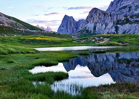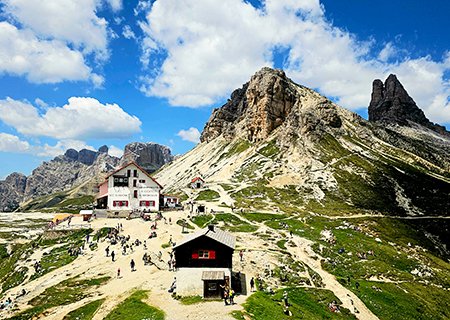 돌로미테 산군에서 가장 유명한 트레치메디 라바레도는 적벽 높이만 약 1,000m 이상인 치마피콜로(2,856m), 치마그란테(3,003m), 치마오베스트(2,972m), 이렇게 세 개의 봉우리로 이뤄진 거대한 암봉입니다. 암벽 등반의 성지로도 불리는 웅장한 세 봉우리 아래에 서면 자연에 대한 경외감이 저절로 생길 정도입니다. 아우론조 산장에서 시작하여 시계 방향으로 봉우리를 가운데 두고 한 바퀴 돌아오는 트래킹으로 트레치메 디 라바레도를 가장 가까이에서 볼 수 있으며, 일몰과 일출의 장엄하고도 아름다운 풍광을 볼 수 있습니다. 돌로미테 최고 트래킹 코스 중 가장 하이라이트로 꼽히는 트레치메 디 라바레도 코스에서 가장 아름다운 돌로미테의 풍광을 눈에 담아보세요