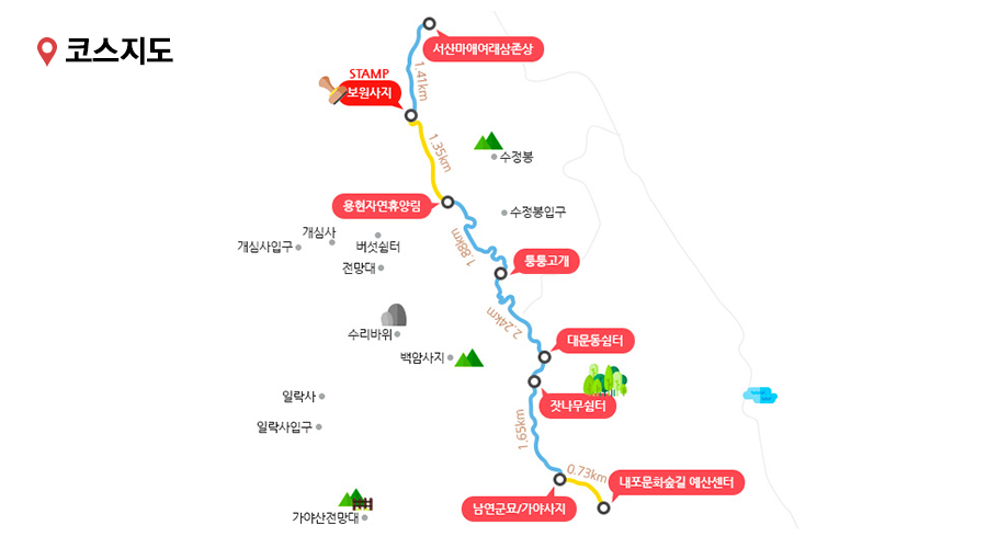 서산 내포문화숲길 트레킹 - 코스: 서산 마애여래삼존불-보원사지-용현자연휴양림-퉁퉁고개-대문동쉼터-잣나무쉼터-남연군묘 -거리: 9.1㎞, 소요시간: 약3시간 -스탬프 위치: 보원사지 * 트래킹난이도 : 하(상) ![]() ![]() 내포불교순례길 5코스
